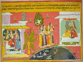 | Description / विवरण | Miniature painting based on Velli Krishna Rukmani. On one side a palace is depicted in which Rukmani is adorning herself with the help of her attendants to meet Krishna. In the centre Kamdev is depicted aiming his arrow, On the other side Krishna and Rukmani are sitting together and the female attendants are standing outside and watching them. on the lower part elephant is depicted plucking a lotus flower. |