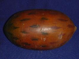 | Description / विवरण | Wooden cucumber, brown in colour with green and red spots on it. Its stem is broken. |