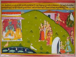 | Description / विवरण | Miniature painting based on Velli Krishna Rukmani depicting on evening scene, where sun is setting and moon is seen in the sky and Rukmani, along with four friends, has come to meet Krishna. The painting also refer about the beauty of that particular evening. |
