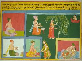 | Description / विवरण | Miniature painting based on Velli Krishna Rukmani depicting various chores of man-a man with a sieve, a man collecting grains, a vidyadhar selling grains and a female buying it, a couple making love, a man with scriptures and a man seated in viman. |