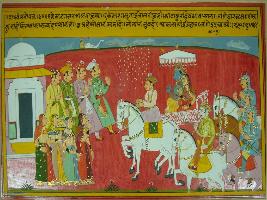 | Description / विवरण | Miniature painting based on Velli Krishna Rukmani depicting Krishna with Rukmani sitting on chariot and accompanied by Baldev and three other horsemen. They are arriving at Dwarika city and people of Dwarika are welcoming them flowers are showering from the sky. |