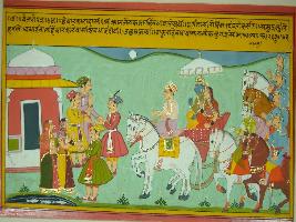 | Description / विवरण | Miniature painting based on Velli Krishna Rukmani depicting Krishna and Rukmani seated in a chariot, accompanied by Baldev and four horsemen, arriving at Dwarika and the people of Dwarika welcoming them. Moon is shining in the sky. |