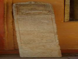 | Description / विवरण | Block of stone having cow feeding its calf carved at top with sun and a moon. The inscription in total has 40 lines starting with formula Shri Ram jyati. It bears date vs. 1967. |