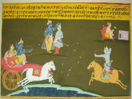 | Description / विवरण | Miniature painting based on Velli Krishna Rukmani depicting a fighting scene between Krishna and Rukma, when Krishna and Rukmani elope in a chariot. Krishna is seen blessing Rukma in the upper part. |