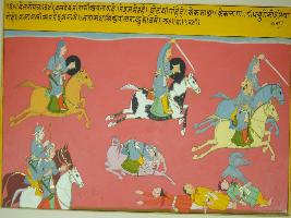 | Description / विवरण | Miniature painting based on Velli Krishna Rukmani depicting a fighting scene between Balram and Shishupal and Jarasandha, where Balram defeats them. |
