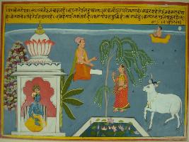 | Description / विवरण | Miniature painting based on Velli Krishna Rukmani depicting Krishna sitting in sanctum at the right part. At the left part a female is standing under a Velli tree. Kamdhenu is seen near her. |