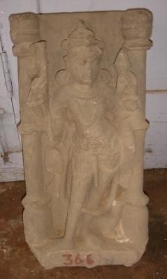 | Description / विवरण | An independent image of 4 armed Vayu in standing position in pillared niche. Attributes from right below i broken ii club iii Lotus iv broken. He is duly ornamented and his vehicle deer is seen near the feet. |