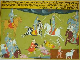 | Description / विवरण | Miniature painting based on Velli Krishna Rukmani depicting a war scene between Baldev against Shishupal and Jarasandha and their armies. Baldev is shown killing them both. |