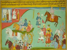 | Description / विवरण | Miniature painting based on Velli Krishna Rukmani depicting elopement of Rukmani. Krishna is shown sitting with Rukmani in a chariot, accompanied by Baldev and horsemen. At the left part, Shishupal is depicted, with his men, following them. At the upper right corner, child Krishna is depicted with Yashoda. |