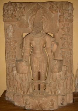| Description / विवरण | Independent sculpture of four handed Vishnu in standing position. The head and all hands are chopped off from elbow. He is flanked by Ayudh purush and attendants. On the left top Shiva is depicted while on the right Brahma is depicted in seated position. Right to Shiva, Kalki avatar and below Shiva Narasimha avatar are depicted. Below Brahma Vamana, Varaha and Matasya avatar of Vishnu are depicted. |