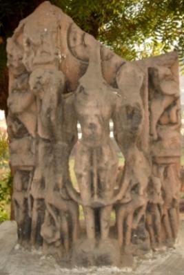 | Description / विवरण | Independent sculpture of Vishnu in standing position. The head, both lower hands are chopped off and the upper two hands holding something but not clear due to mutilations. To his each side a vyala and four attendants are seen but all figures are mutilated. |