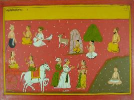 | Description / विवरण | Miniature painting based on Mahabharat - Ashwamegh parva depicting Purohit talking to Naga and in lower part a woman is sitting in chariot and two persons are standing with folded hands in front of another woman. |