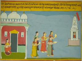 | Description / विवरण | Miniature painting based on Velli Krishna Rukmani depicting Rukmani sitting alone and thinking about Krishna in the right side of the painting. In the left side she is going along with her friends to Mata s temple to worship. |