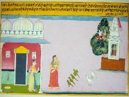 | Description / विवरण | Miniature painting based on Velli Krishna Rukmani depicting Rukmani lost her senses in the loving memories of Krishna and therefore goes to Mata s temple to worship for him. Parrots and birds are watching her and Kamdev and Rati are seated on a tree. |
