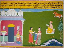 | Description / विवरण | Miniature painting based on Velli Krishna Rukmani depicting the beauty of Rukmani. Rukmani is changing her clothes in the right part. At the upper left corner Navagrahas are seen over the head of a tiger. Below it Sukhdev is depicted holding a manuscript, which is compared with the nose ring of Rukmani. A creeper is seen on a tree and lotus flowers are blooming in the pond. |