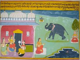 | Description / विवरण | Miniature painting based on Velli Krishna Rukmani depicting Rukmani getting dressed and doing shringar. In the left part, small figure of Vishnu, seated Bhavani and a standing elephant are depicted. |