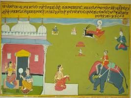 | Description / विवरण | Miniature painting based on Velli Krishna Rukmani depicting Rukmani doing shringar and a female attendant holding the mirror for her. In the centre Rukmani is sitting and Rukma, the brother of Rukmani is seated on an elephant. Kamdev Shiv, Brahma and Indra are seen on the upper part of the painting. |