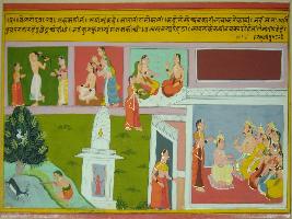 | Description / विवरण | Miniature painting based on Velli Krishna Rukmani depicting Rukmani in the upper part of the painting, which show the toilet scenes and getting ready and some female attendants serving her. In the lower part, a man is hunting a deer. In the left side the king is talking with nobles and women. |