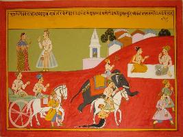 | Description / विवरण | Miniature painting based on Mahabharat - Ashwamegh parva depicting Brishketu who is talking with his queen that when he will go for war in favour of Pandavas not to deny him. |