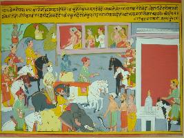 | Description / विवरण | Miniature painting based on Velli Krishna Rukmani depicting Krishna with his brother Balram and other men, arriving to Kundanpur and people are looking at them. In him, women see the image of Kamdev, enemy see Kaal, devotees see Narayan. At the lower left, sages are shown near temple. |