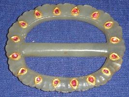 | Description / विवरण | A buckle made of marble stone, having flower design in the corner while some pearl are fixing in the inner part of the buckle. |