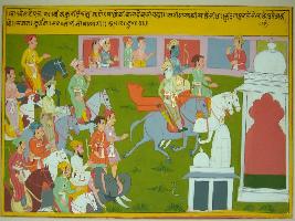 | Description / विवरण | Miniature painting based on Velli Krishna Rukmani depicting Krishna and Balram entering Kundanpur with their friends. People of Kundanpur are depicted admiring them. |