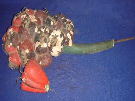 | Description / विवरण | A bunch of Sahtoot, made of plastic, of red and violet colours and having a green stem. |