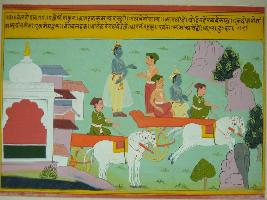 | Description / विवरण | Miniature painting based on Velli Krishna Rukmani depicting Krishna listening a message from a messenger. Then he calls a chariot and leaves with the messenger. The name of the horses, which are drawing the chariot are-Sugriv Sen and Meghpushpa. |