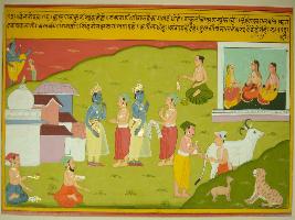 | Description / विवरण | Miniature painting based on Velli Krishna Rukmani depicting Vishnu stepping on Bali, Krishna talking to a Brahman, three women talking, a man cleaning the tail of a cow. At the lower corner a tiger is shown with a Fox. |