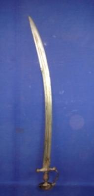 | Description / विवरण | Sword with slightly curved blade with grooves, the handle is made of iron todedar Knuckle guard without any designs. |