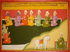 | Description / विवरण | Miniature painting based on Mahabharat - Ashwamegh parva depicting Arjun and Pradyuman where Arjun says that king Harishdhwaj took away the horse and to receive the horse Jambunash. Satyaki Kritvarma went there. |