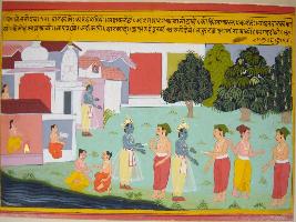 | Description / विवरण | Miniature painting based on Velli Krishna Rukmani depicting a scene of Dwarika where people are doing their chores. Krishna is giving and receiving letter from a messenger. |