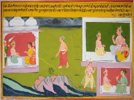 | Description / विवरण | Miniature painting based on Velli Krishna Rukmani depicting prince Rukma meeting his father and telling that Shishupal is appropriate for Rukmani as a husband at left panel. In the right part, king Shishupal is shown sitting in a palace with his noble. |