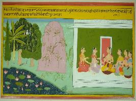 | Description / विवरण | Miniature painting based on Velli Krishna Rukmani depicting departure of Shishir season and coming of Basant and here Shishir season is compared with childhood and Basant with adulthood. Rukmani is becoming an adult and ready for marriage. At the right part, Basant season is depicted coming in forest. Kamdev is shown sitting with Rati over a tree. At the left, Rukmani is shown sitting with her friends. |