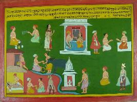 | Description / विवरण | Miniature painting based on Mahabharat - Ashwamegh parva depicting that one who donates food to Brahman and serves god, he is loved by Vishnu. On who respects women gets moksha. One who steals gold is a sinner and to get rid of it, he should donate gold to Brahman and goldsmith. |