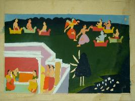 | Description / विवरण | Miniature painting depicting the celebration by Vidyadhars and Gandharvas as they are singing and dancing. A woman is shown giving birth at the right side with three Devtas in vimans above the house. It is an incomplete painting. |