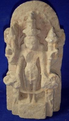 | Description / विवरण | Small independent sculpture of four handed Vishnu. Attributes from right below- 1 conch 2 lotus 3 mace 4 chakra. He is wearing a Kirti mukuta and part of his body is chopped off. Whole figure is mutilated. |