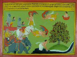 | Description / विवरण | Miniature painting based on Mahabharat - Ashwamegh parva depicting Krishna asking Arjun s to put head in river. Arjun touches head. Krishna remembered Garuda and he made his appearance. Krishna asked him to take this head to Prayaga. Garuda took head to Prayaga and throw in holy water of Ganga. |