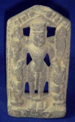 | Description / विवरण | Independent sculpture of four armed Vishnu in standing pose. Attributes are not clear. He is flanked by two female attendants in seated position near his feet at both sides. |