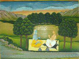 | Description / विवरण | Miniature painting based on Vishnu Puran depicting territory of demon king Hiranyakashyap on the right side of the painting. While on the left side, Indra is seen with other gods and they are asking help from Vishnu to kill Hiranyakashyap. |