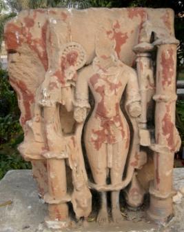 | Description / विवरण | An independent image of four armed Vishnu in standing pose in pillared niche. His head and lower two arms are missing. In the upper two arms holding chakra and mace. The image is duly ornamented. |
