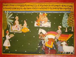 | Description / विवरण | Miniature painting based on Mahabharat - Ashwamegh parva depicting Yudhisthir asking Vyas rishi about the daan given during performance of Ashwamegh yagna. Vyas told him, daan should be made to 20,000 Brahma. Each Brahman should be given one chariot, one horses, one Kilo of Gold. |