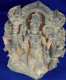 | Description / विवरण | Independent sculpture of four armed Vishnu in standing position under a pillared niche. His attributes from right below a missing b conch c chakra d rosary. There are two vyala figures on each side. |