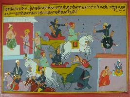 | Description / विवरण | Miniature painting based on Mahabharat - Ashwamegh parva depicting Brishketu attacking and killing the armies, as if worshipping of god removes all sins. A messenger informed this to Jambanaswa and said that our 1000 army is dead, hearing this, king is shaking in fear. |