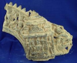 | Description / विवरण | Sculptured architectural fragment depicting Vishnu in seated position in pillared niche. His two arms are resting on thigh and in the upper right arm holding chakra and a mace in the upper left arm. On each side one female attendant is depicted. On the left side one crocodile is depicted from which a human is coming out. And on the upper right two male deities are there. |