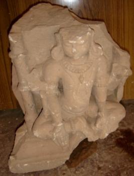 | Description / विवरण | Independent sculpture of four armed Vishnu, three arms are missing. One arm is in varada mudra. His mukuta is missing. He is adorned with jewels and armour. |