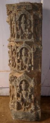 | Description / विवरण | Architectural fragment of a panel depicting two seated Vishnu on upper part and one standing Vishnu in lower part in pillared niche. Attributes of Vishnu from right below on top - i Chakra ii mace iii conch iv lotus. Attributes of Vishnu from right below - i Lotus ii conch iii chakra iv mace but broken . The upper two Vishnu are flanked by one female attendant at each side while the Vishnu at bottom is flanked by two vyala figures which are broken . There is one vyala, a dancing male and a standing female at the extreme right respectively from top to bottom. |