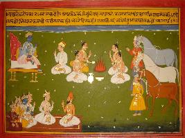 | Description / विवरण | Miniature painting based on Mahabharat - Ashwamegh parva depicting Vyas rishi telling Pandavas about the importance of Ashwamegh yagna. He told that king Ramchandra performed Ashwamegh yagna three times. He left kingdom and went to vana. Ram is depicted at upper part and shown performing yagna with horses standing nearby. |
