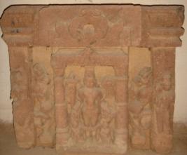 | Description / विवरण | Sculptured architectural fragment depicting four armed Vishnu standing in pillared niche. His attributes from right below. i varada mudra, ii mace, iii chakra, iv conch. Two attendants are seen near his feet. On the two sides of Vishnu, 2 vyalas and 2 attendants are depicted. The left one is holding a mace and right one in dancing pose. |