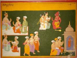 | Description / विवरण | Miniature painting based on Vrihat katha depicting a king talking to two seated ministers, a red demon talking to two sages and three men worshipping Shiv. |